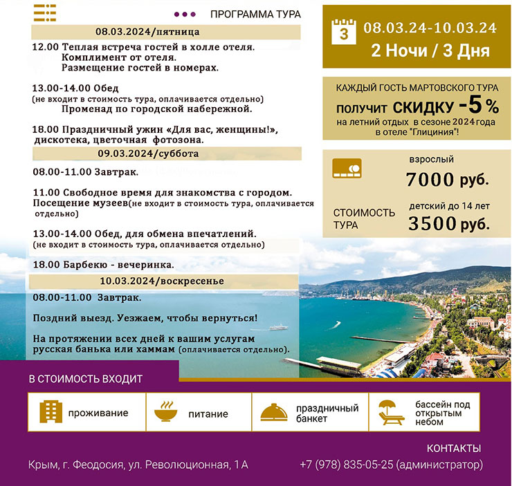 День 8 марта в отеле Глициния, Феодосия, Крым