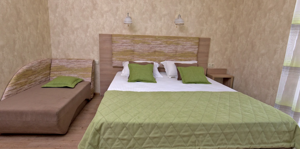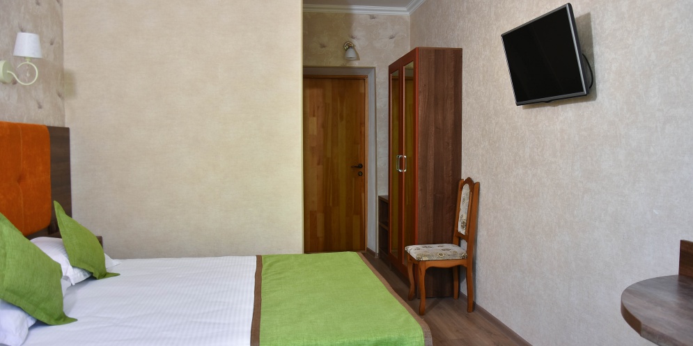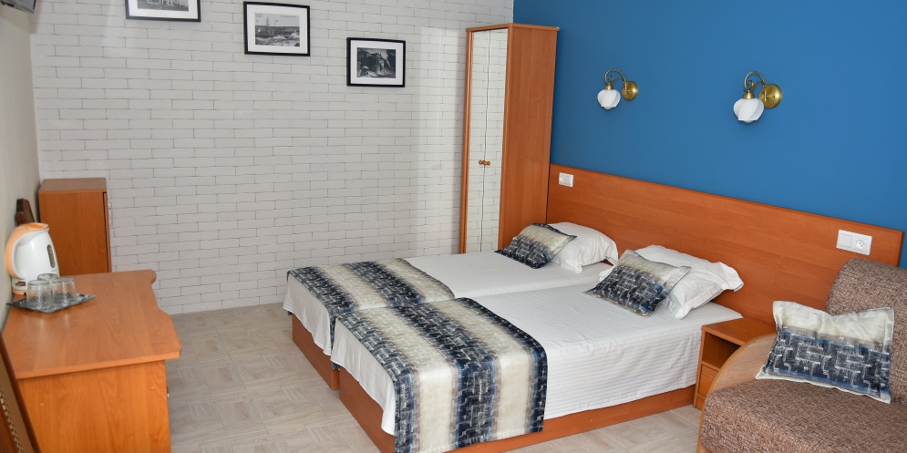 ТИП А: Стандартный 2-х местный однокомнатный номер на 2-м, 3-м этажах с двухспальной кроватью, с телевизором, холодильником, кондиционером, санузлом, зоной Wi-Fi, видом с балкона на море. Дополнительное место – диван либо кресло–кровать.