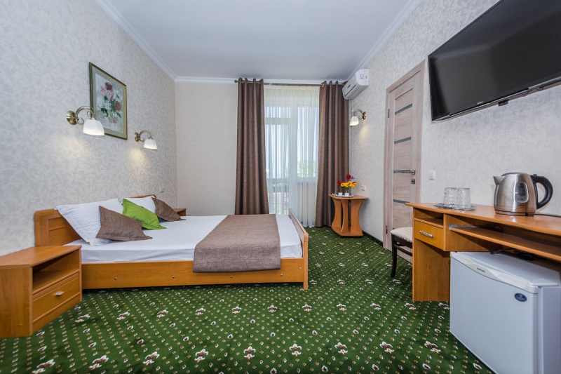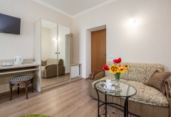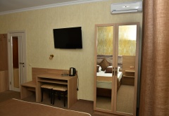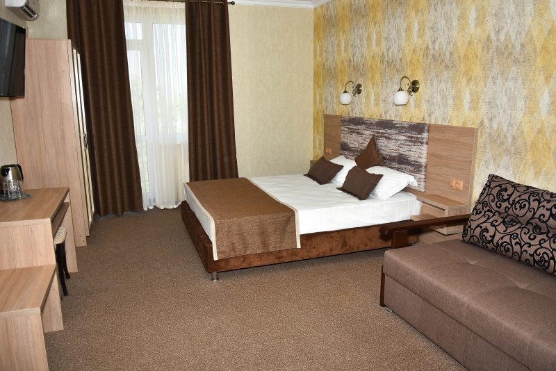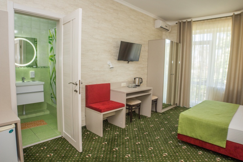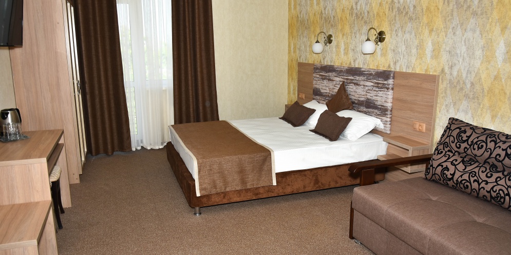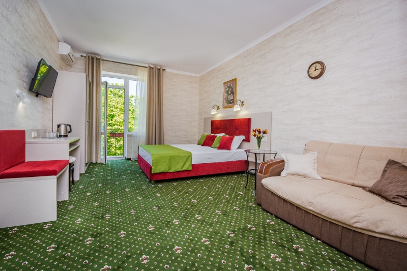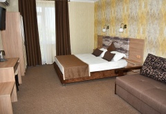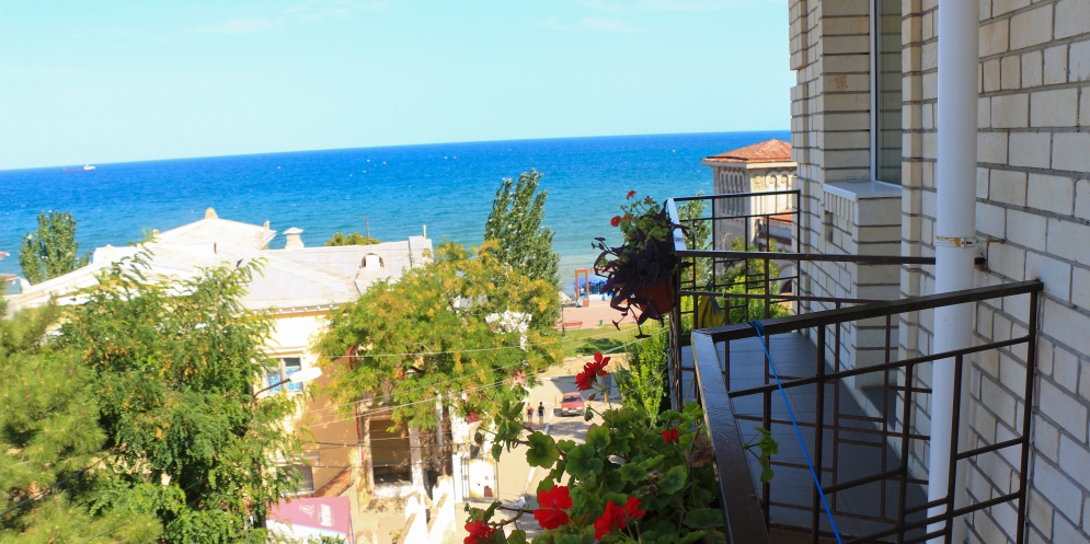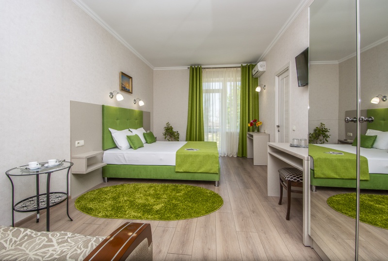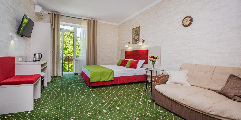 Трехместный номер на 2-м, 3-м, 4-м этажах, с одной двуспальной кроватью, телевизором, холодильником, кондиционером, санузлом, зоной Wi-Fi, видом с балкона на море. Дополнительное место – диван