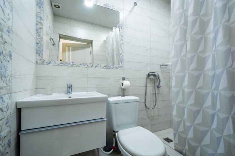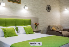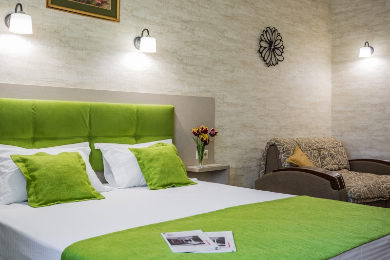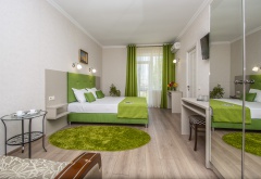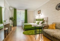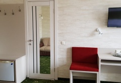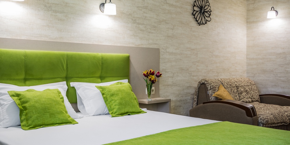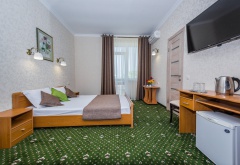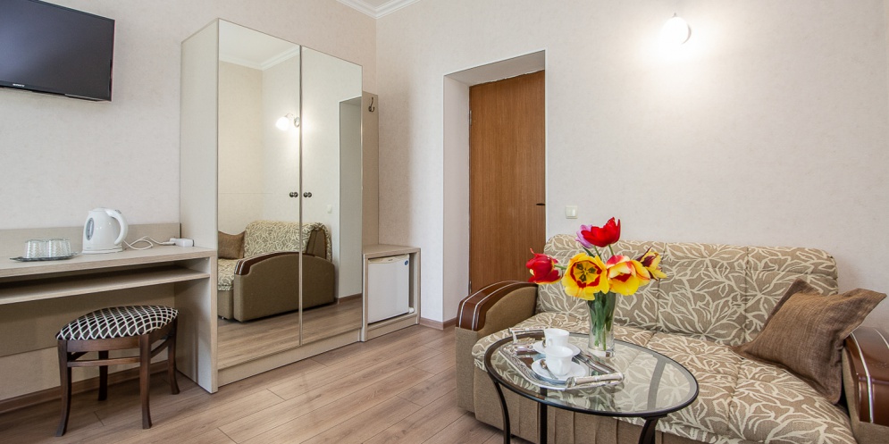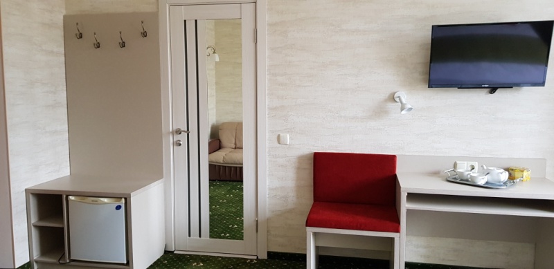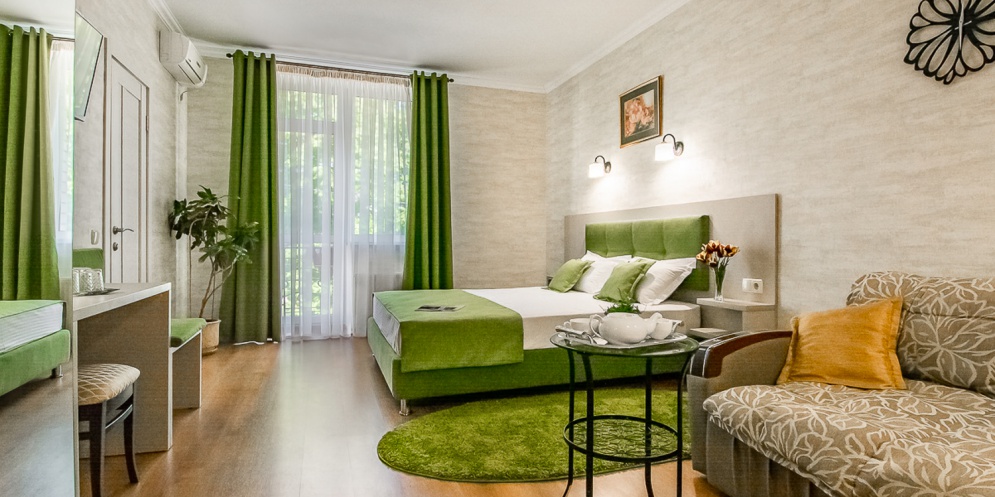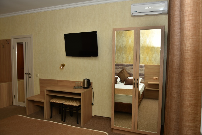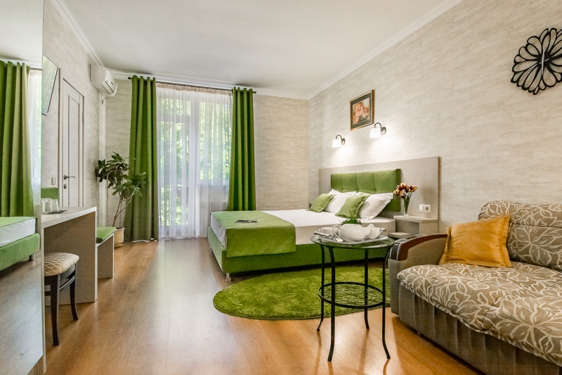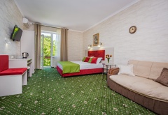 Трехместный номер на 2-м, 3-м, 4-м этажах, с одной двуспальной кроватью, телевизором, холодильником, кондиционером, санузлом, зоной Wi-Fi, видом с балкона на море. Дополнительное место – диван
